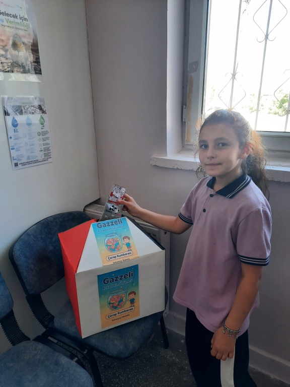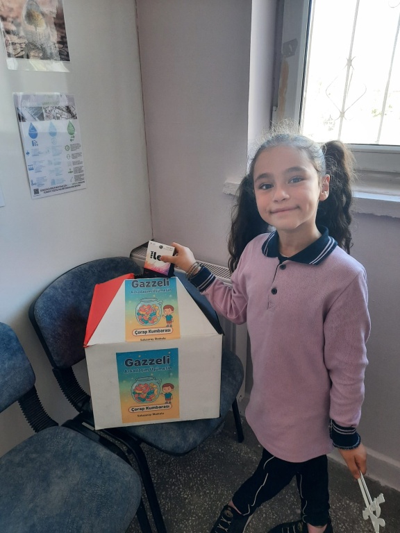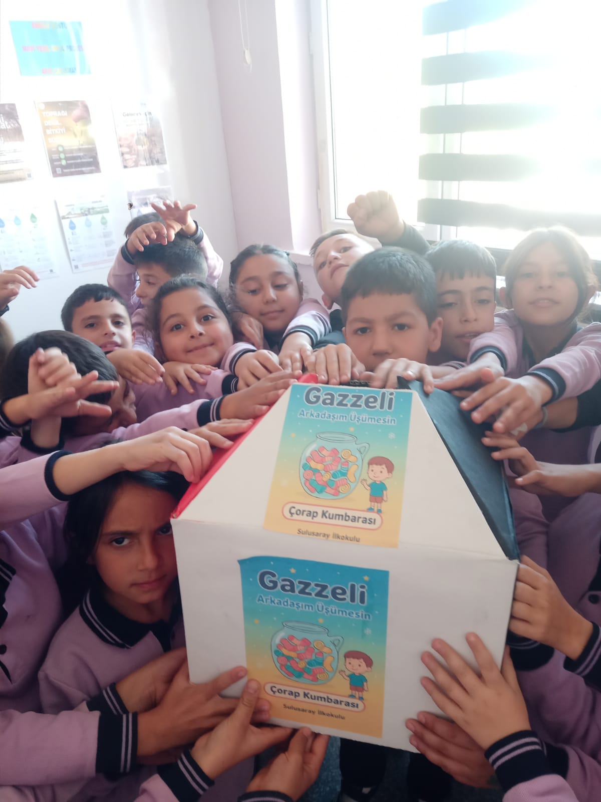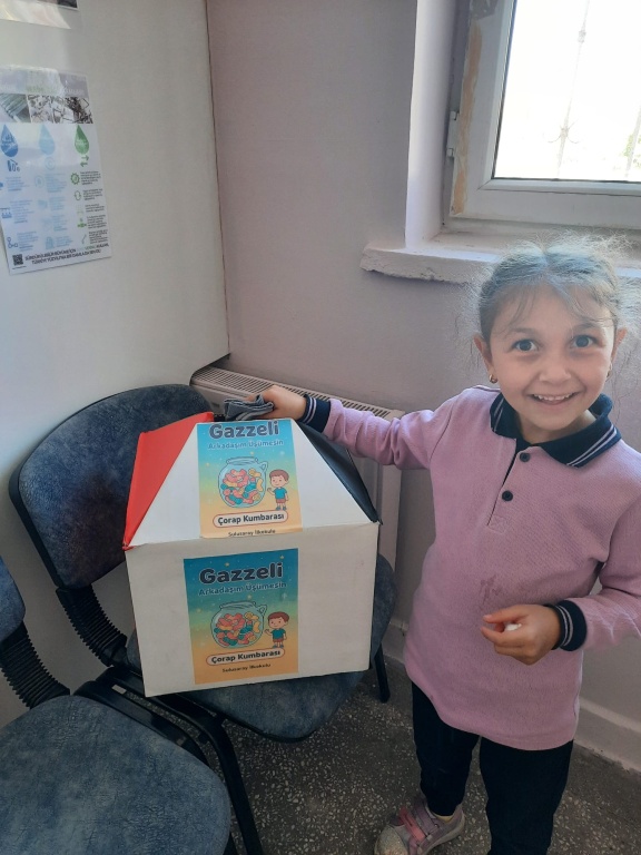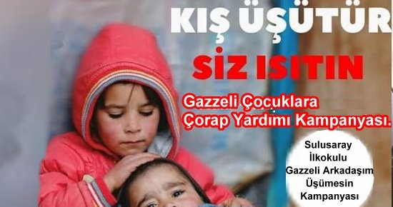 Gazze’de yaşanan insanlık dramı her geçen gün derinleşiyor. Evleri yıkılan, yerinden edilen on binlerce insan, özellikle de çocuklar, şimdi de çetin kış şartlarıyla mücadele etmek zorundular Barınma, ısınma ve giyecek gibi temel ihtiyaçlardan yoksun olan Gazzeli çoçuklara Kasabamız ilkokulu öğrencileri bu zorlu kış günlerinde Gazze’deki kardeşlerinin yanında olmak, onların acısını ve soğuğunu bir nebze olsun dindirmek için “Gazzeli Arkadaşım Üşümesin” sloganıyla kullanılmamış çorap toplama kampanyasını başlatılar Öğrencilerimiz bir farkındalık oluşturmak amacıyla “Çorap Kumbarası” yaparak kullanılmamış çorap toplayarak Gazzedeki kardeşlerine desteklerini göstermeye çalışıyorlar.