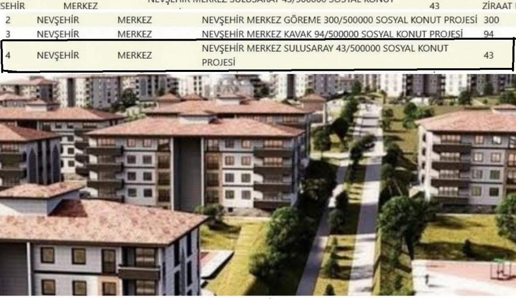 Cumhurbaşkanımız Sayın Recep Tayyip Erdoğan’ın liderliğinde başlatılan “Ev Sahibi Türkiye” projesi kapsamında, Nevşehir ilimiz genelinde 2.068 yeni sosyal konut inşa ediliyor bu 2068 yeni sosyal konut projesi kapsamında Kasabamıza 43 konut inşa edilecek.Konut başvurularının Kasım ayı içerisinde başlaması tahmin ediliyor.